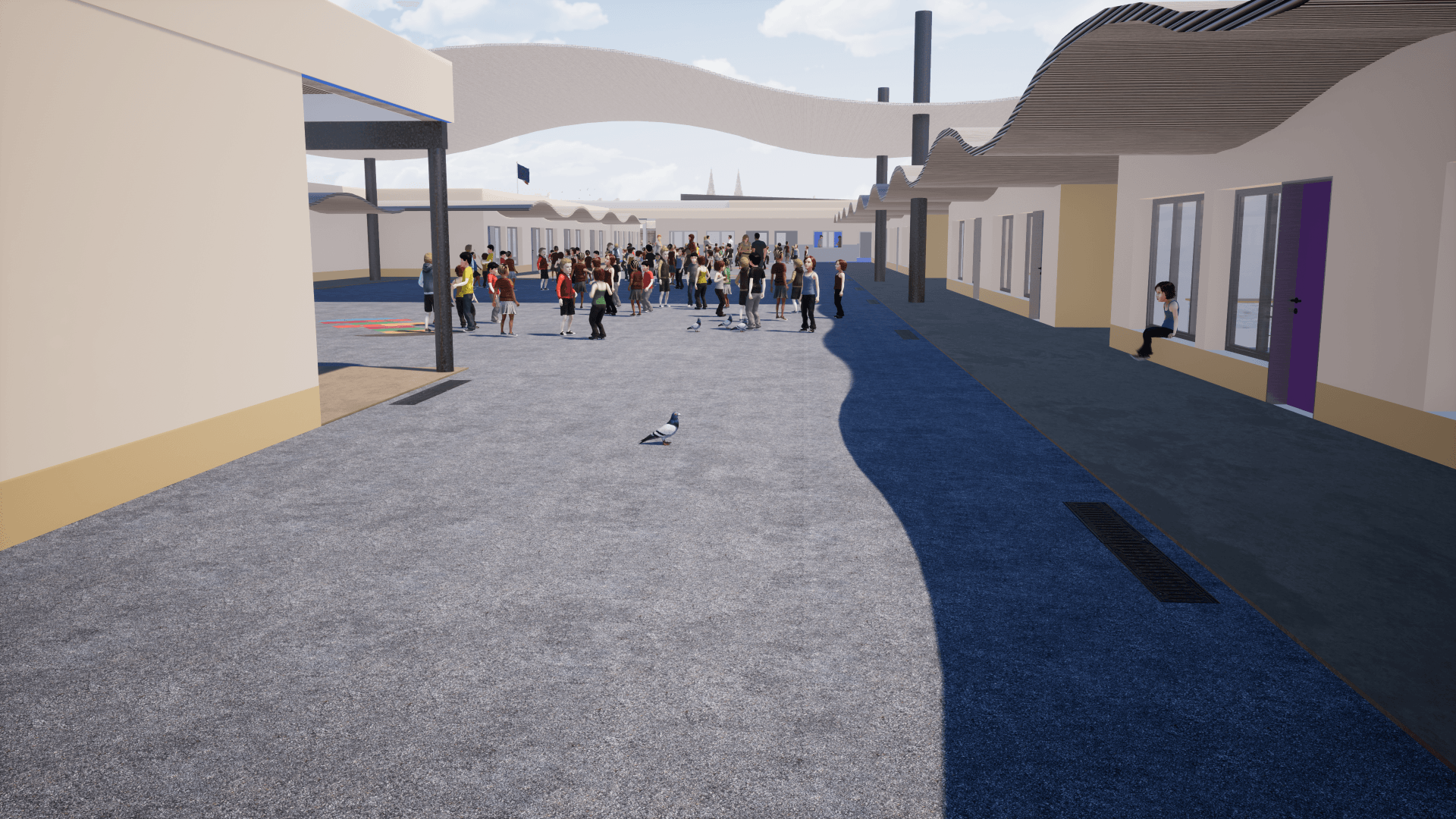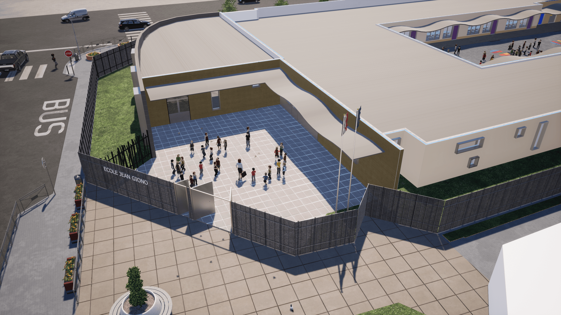 > avec 19 salles dont 4 salles de classe supplémentaires, 3 salles-tampons et une extension optionnelle en étage pour tenir compte de l’évolution démographique du quartier, à court, moyen et long terme.