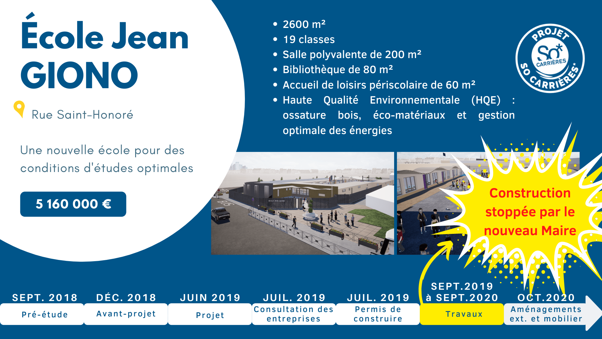 Avec le travail de fond de l’équipe SoCARRIÈRES* avec Christophe DELRIEU, les jeunes Carriérois de l’école élémentaire Giono seraient déjà dans une école neuve depuis la rentrée scolaire 2020. Ils ont déjà attendu 2 années scolaires et devront encore attendre plus d’une année scolaire.